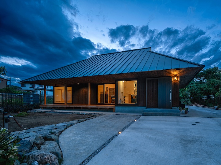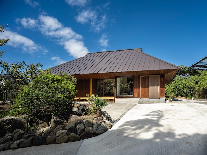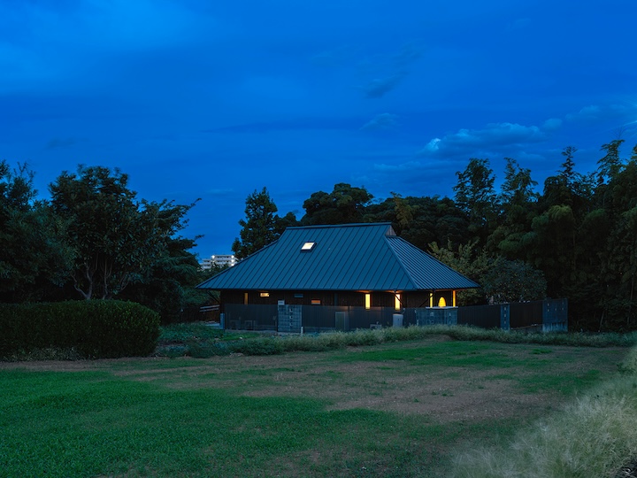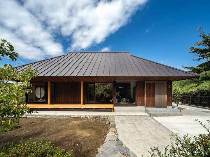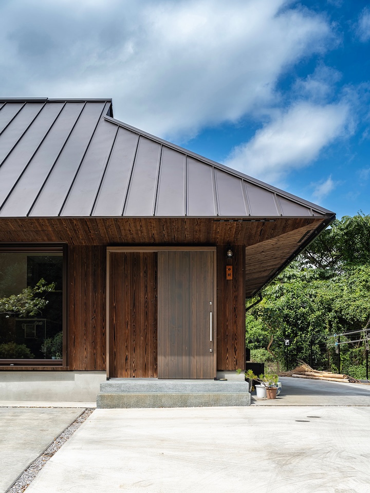 ゆとりのある敷地に茅葺き屋根を現代的に読み解いた大きな屋根を被せる。畑と木々に囲まれた環境にこの家がしっかりと馴染んでいくためには、この存在感のある屋根がどうしても必要だった。この屋根こそが、古くから日本人に刻まれた田舎暮らしというミームを呼び起こす依代となる。