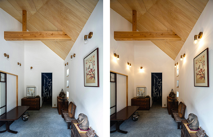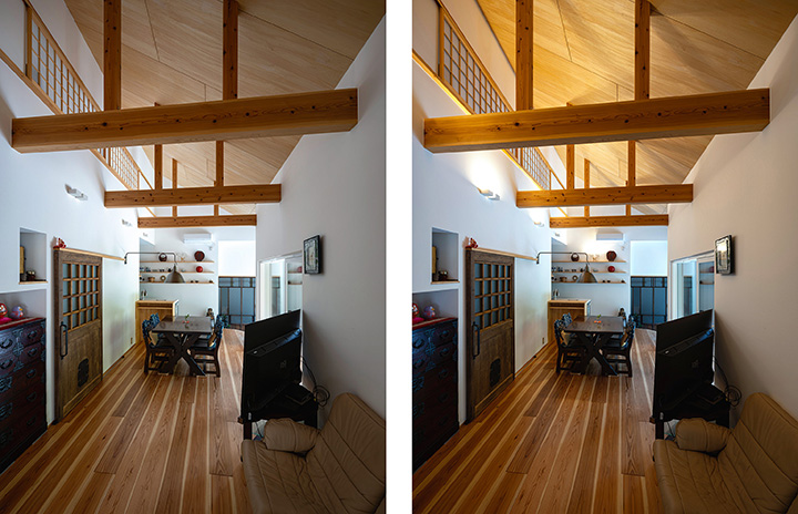 奥へと奥へと水平に伸びていきながら、上へ上へと垂直にも伸びていく空間が、平屋の家にゆとりと変化をもたらしてくれる。
